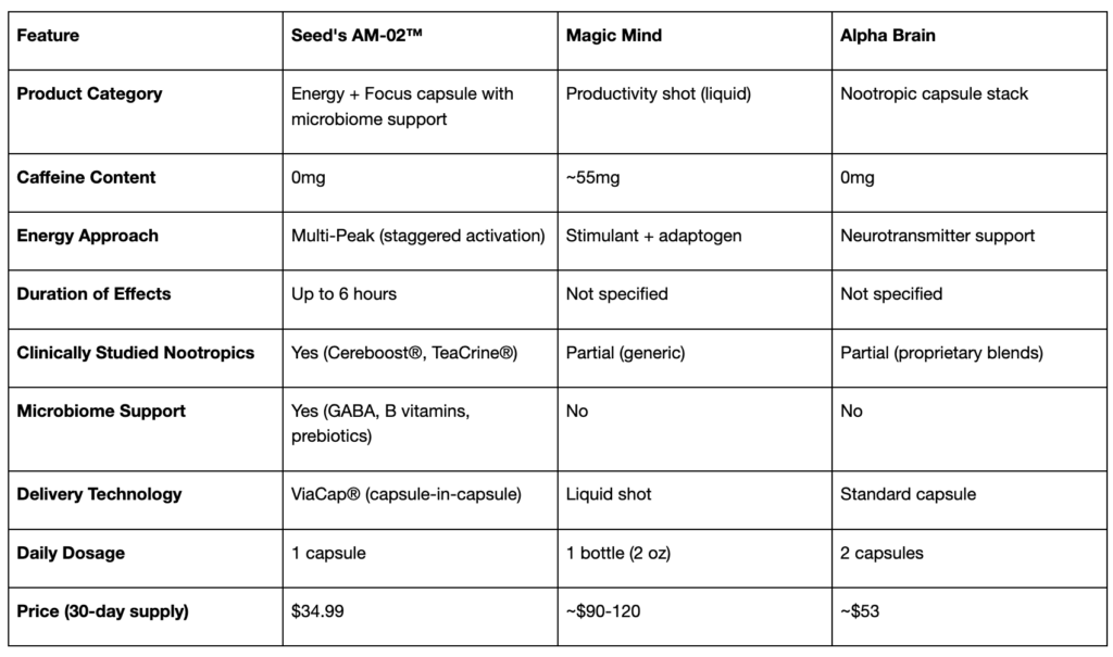 Each product takes a different path: Magic Mind pairs caffeine with adaptogens in a drinkable format. Alpha Brain offers a stimulant-free nootropic stack built around neurotransmitter support. AM-02™ combines caffeine-free nootropics with gut-brain support at the lowest price point.